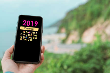 Woman hand using smartphone do planning in 2019 to digital calendar application. Business communication technology concept.