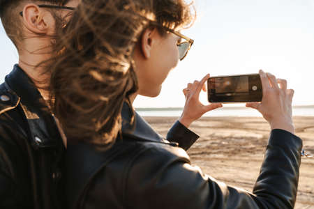 Beautiful young lovely couple spending time amazing time at the sunny beach, taking a picture