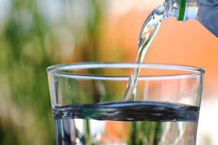 From a transparent bottle, water is poured into a glass. The concept of World Water Day.