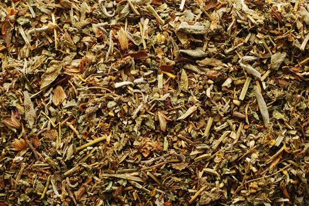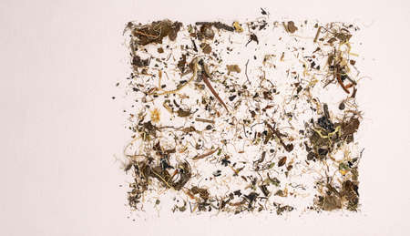 Organic dry herbal tea leaves, close up. Composition of dried teas from above, copy space.