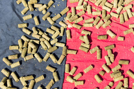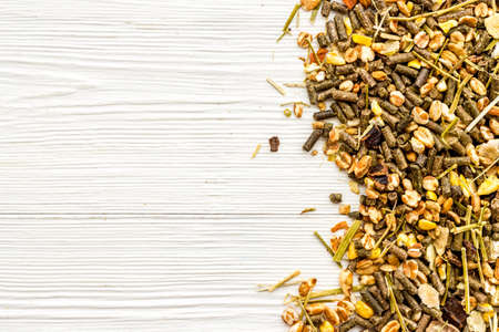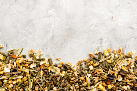 Top view of dried rodent food and treats. Flat lay of food for pets