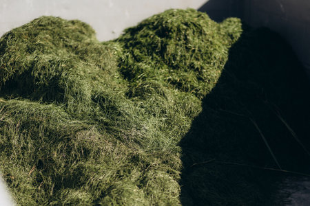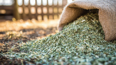 A sack of freshly cut green hay spills onto dry ground, showcasing vibrant colors and natural textures in a peaceful rural farm environment.