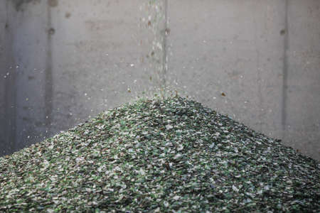 Details with shards of glass falling from a conveyor belt on a pile in a glass recycling facility.