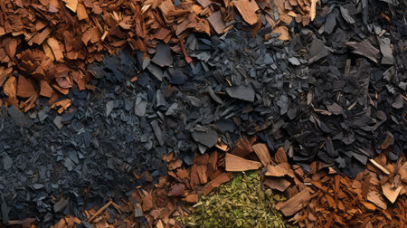 a super wide aerial view photo texture showcasing a vibrant and textured mix of microfiber yard mulch. the image captures the thick impasto texture of this industrial material, highlighting its raw and gritty nature. with its high resolution, the photo reveals the flat surfaces of this recycled and natural resource, adding a touch of trashcore aesthetic. ai generated