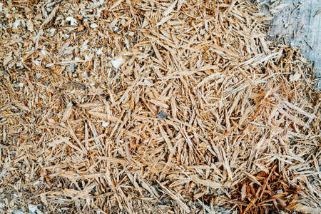 Small pile of old and fresh wood shavings on a concrete surface. High angle