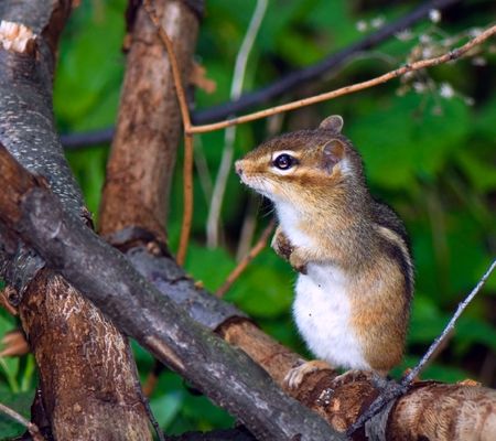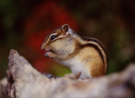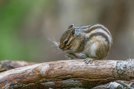 Cute wild chipmunk with one stuffed cheek standing on wooden log