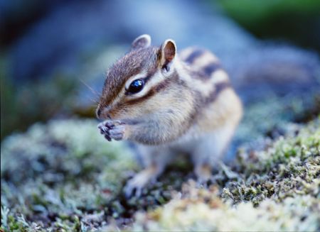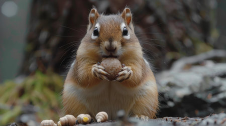 A cute chipmunk eating nuts on a stone in a forest with a blurry background