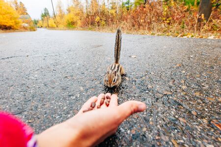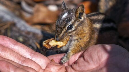 Chipmunk is eating sunflower seeds from a human hand. close-up