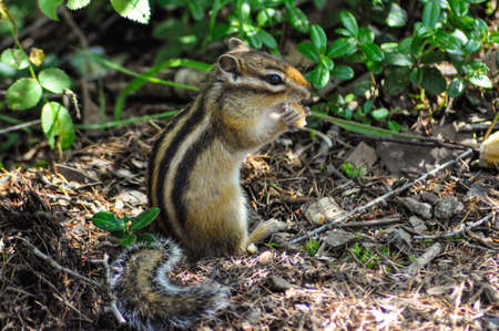 A wild chipmunk (Tamias Striatus) stands on its hind legs looking for food.