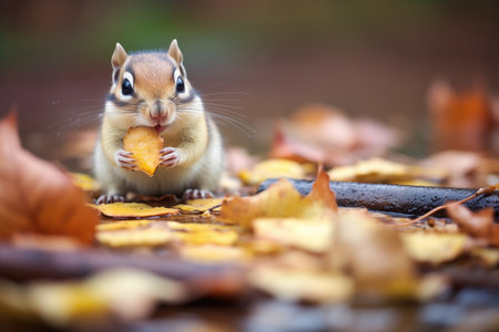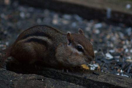 Chipmunk eating peanuts on a wooden board deck in autumn forest.