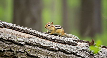 Adorable chipmunk perched on a mossy log in a lush forest. Close-up view showing details of its fur and surroundings.