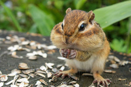 Chipmunk eating sunflower seeds. Yellow ground squirrel chipmunk eating feeding grains and hiding stockpile them in cheek pouches. Wild animal in nature outside. Web banner header.