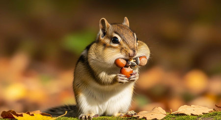A cute chipmunk sits on a mossy log, intently eating a nut with its paws. The animal has a focused expression and is surrounded by autumn foliage.