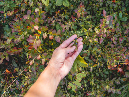 man picks blueberries in the forest. blueberry bushes in the forest
