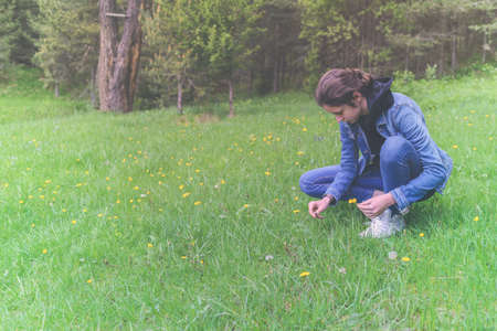 Beautiful teen girl picking flowers on the meadow.