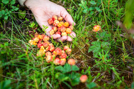 Female hand full of ripe gathered cloudberries