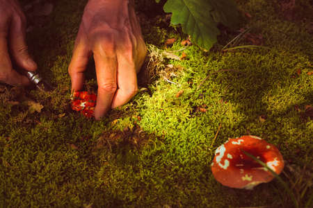 Close up of a hands of a man cuting a mushroom in the forest
