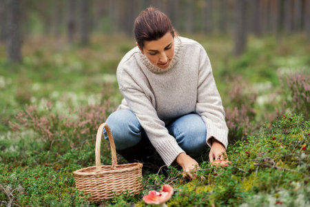woman with basket picking mushrooms in forest
