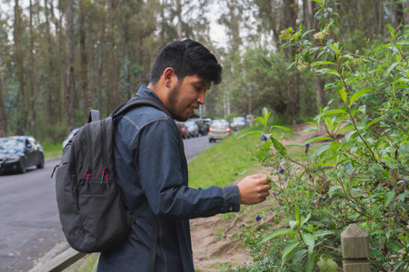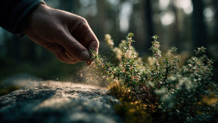 A man gently touches leaves, embracing a mindful moment in nature. The close-up captures the serene connection between human and environment, highlighting tranquility and awareness.