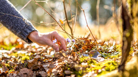 Closeup of female hand about to pick an early purple spring flower in a forest on a beautiful sunny early spring day.