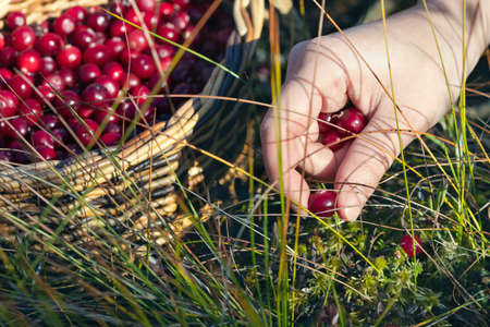 Womans hand picking ripe cranberries in the swamp