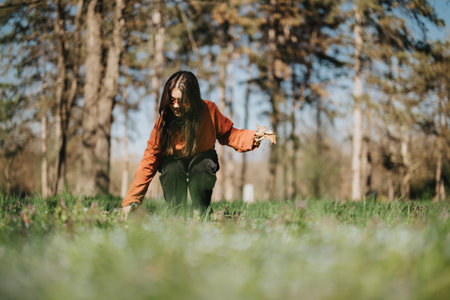Young woman kneeling in a park, picking plants from the grass on a sunny day