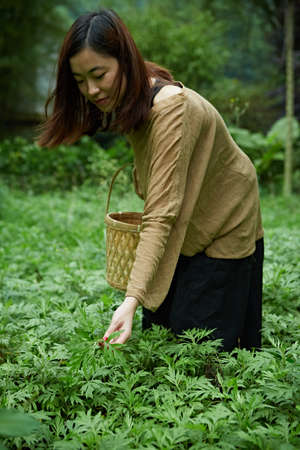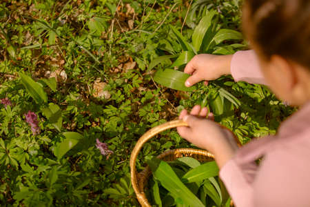 Woman picking wild garlic (allium ursinum) in forest. Harvesting Ramson leaves herb into wicker basket. Herbal harvest