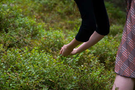 young beautiful girl is picking wild blueberries. Female hand gathering blueberries. Harvesting concept.