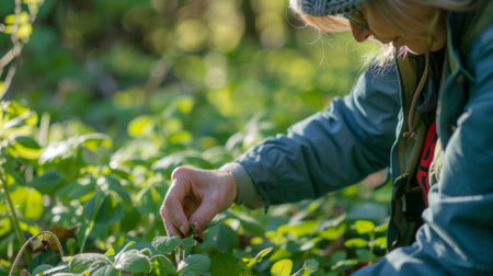 Picking fresh wild berries at forest edge with dappled light creating peaceful and natural atmosphere