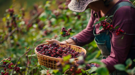 A woman carefully gathering wild huckleberries to make a traditional jam recipe passed down through generations