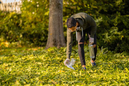 Committed volunteer cleaning garbage on grass in nature