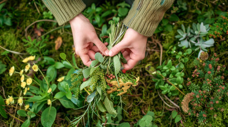 Hands gathering fresh herbs from a lush garden, surrounded by green plants. Concept of herbal healing, organic living, and sustainable gardening. Perfect for wellness and eco-friendly medicine