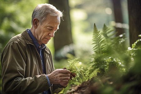 A man observing a plant in a serene forest setting