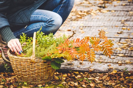 Girl takes basket of orange leaves of mountain ash and other green plants against the background of wooden boards in autumn view