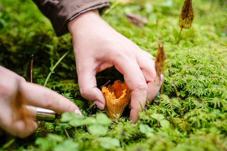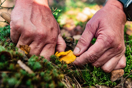 Picking wild forest yellow chanterelles mushroom harvest.