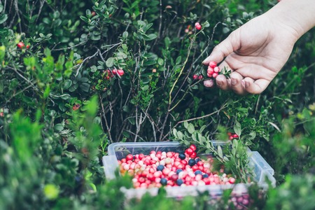Picking lingonberry. Woman gathering wild berries.