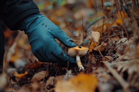 A gloved hand reaches for a mushroom on the forest floor surrounded by colorful autumn leaves. The forest is serene, showcasing rich earth tones and natural beauty.