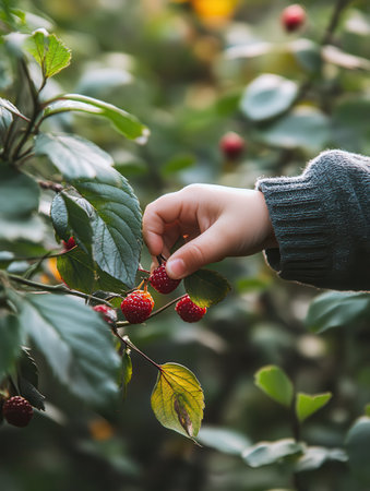 A child's hand reaches for a cluster of ripe berries nestled among vibrant green leaves. The setting is a lush garden, illuminated by warm sunlight, depicting a joyful harvest moment.