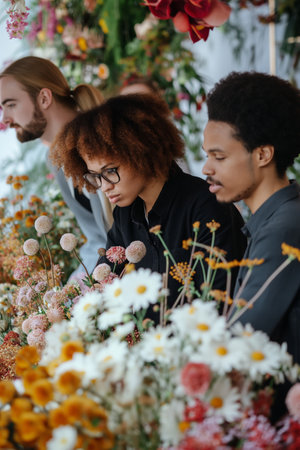 Diverse Group of Young People Arranging Flowers at Outdoor Market.