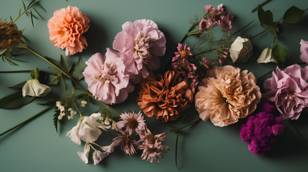 AI Generated. Blurry bouquet of flowers on teal background