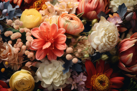 Colorful mixed flower bouquet background, beautiful, vivid. Generative AI.