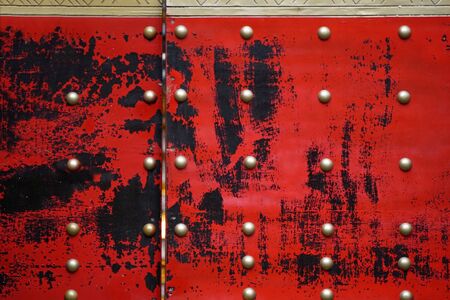 Vintage red or orange wooden door or window for background with black stainless steel symbol. Retro wood wallpaper with shadow at temple Tokyo, Japan.