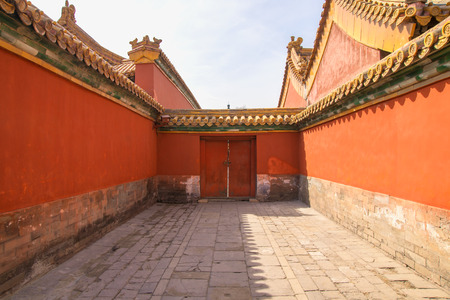 Beijing, CHINA JAN 16 2019: The Forbidden palace - old red door with the paper abd the bricks. The part of inside of the forbidden palace. It’s the old chinese style.