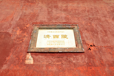 Yi County, China-November 4, 2017: The handwriting of Qing Xiling is carved on the red wall, Yi County, Hebei Province, China