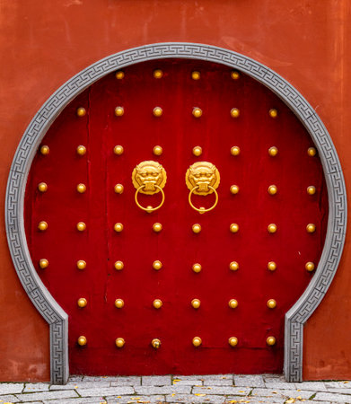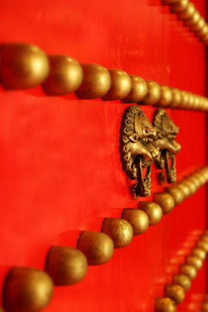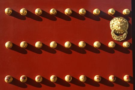 The door of the Forbidden City in Beijing, China. The door is decorated with a lion's head.