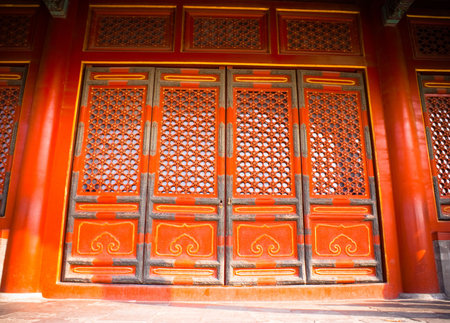 Chinese traditional style wooden door and red wall in the Forbidden City, Beijing, China