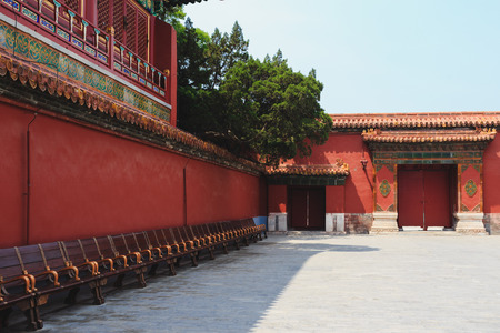 The ancient buildings with red wall, gray tile roof, and tree shadows in the Forbidden City, Beijing, China