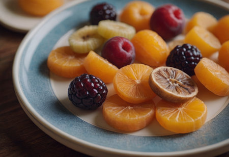 Closeup of mixed fruit in a plate on the wooden table. Generated by AI