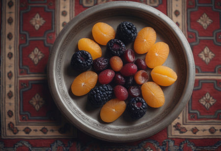 Fruit mix in a plate on the background of the oriental carpet