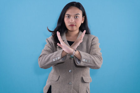 A serious young woman in a brown blazer stands against a blue background, making an X sign with her arms to signal refusal or disagreement.